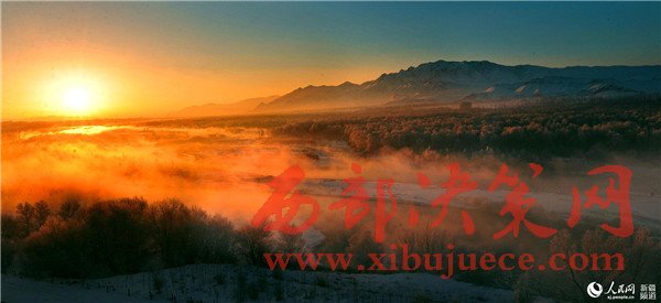 綿延百里的新疆尼勒克縣喀什河谷次生林在冷空氣的作用下,霧氣蒸騰,21萬(wàn)畝林帶凝成了玉樹(shù)瓊花的霧凇景觀。迎著日出的霞光,從山上向下俯視,整個(gè)河谷云蒸霞蔚,宛如置身云端。翻滾的云海讓遠(yuǎn)山和近樹(shù)若影若現(xiàn),恍若仙境。待太陽(yáng)升高,再浮現(xiàn)河谷次生林帶,猶如一條晶瑩剔透的玉帶飄落在天山之下。