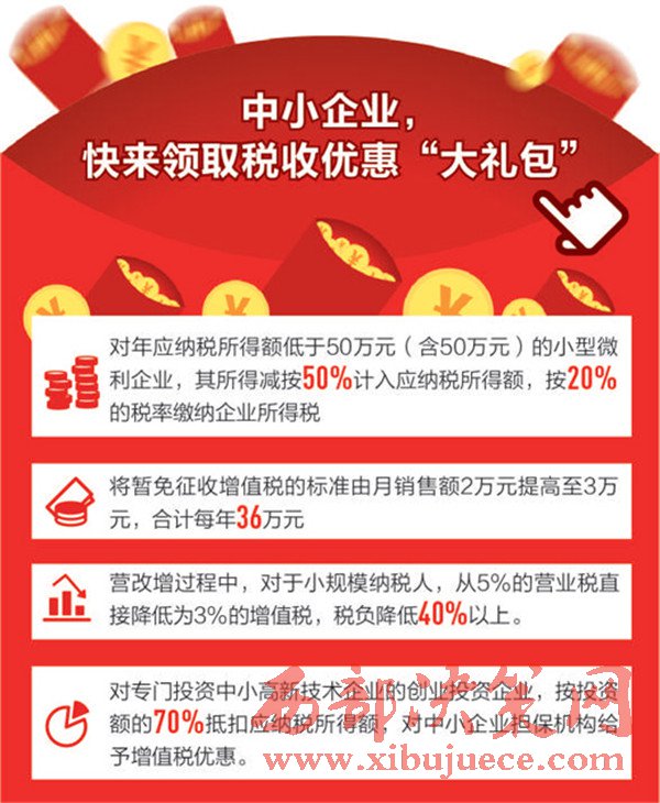 日前國務(wù)院常務(wù)會(huì)議決定,在今年已出臺(tái)4批政策減稅降費(fèi)7180億元的基礎(chǔ)上,繼續(xù)出臺(tái)多項(xiàng)降費(fèi)舉措,預(yù)計(jì)每年可再減輕企業(yè)負(fù)擔(dān)2830億元,合計(jì)全年為企業(yè)減負(fù)超過1萬億元。今年以來,國家持續(xù)推出減稅降費(fèi)措施,讓企業(yè)輕裝上陣,成為推進(jìn)供給側(cè)結(jié)構(gòu)性改革、培育我國競爭新優(yōu)勢的重要舉措。就在國務(wù)院出臺(tái)多項(xiàng)降費(fèi)舉措的同時(shí),財(cái)政部、國家稅務(wù)總局也發(fā)出通知,將享受所得稅優(yōu)惠政策的小型微利企業(yè)年應(yīng)納稅所得額上限由30萬元提高至50萬元,自2017年1月1日至2019年12月31日,對年應(yīng)納稅所得額低于50萬元(含50萬元)的小型微利企業(yè),其所得減按50%計(jì)入應(yīng)納稅所得額,按20%的稅率繳納企業(yè)所得稅。