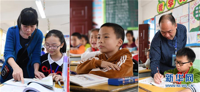 這是一張拼版照片,左圖為:在廣西南寧市馬山縣白山鎮(zhèn)合群初中,溫華芬老師在課后輔導學生功課(4月10日攝);中圖為:在馬山縣白山鎮(zhèn)同富小學,侯宇宸在聽課(4月10日攝);右圖為:在馬山縣白山鎮(zhèn)同富小學,侯瑞良老師在輔導學生功課(4月10日攝)。2017年9月,廣東茂名選派優(yōu)秀教師到廣西馬山縣支教。茂名市電白區(qū)木蘇中學老師溫華芬得知后,與在電白區(qū)陳村中學任教的丈夫侯瑞良積極響應(yīng),決定帶上9歲的兒子侯宇宸共同來到馬山縣,開展為期一年的支教活動。新華社記者 陸波岸 攝