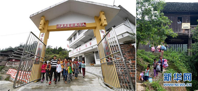 這是一張拼版圖片,左圖為2017年11月17日,廣西三江侗族自治縣洋溪鄉(xiāng)安馬小學寨全教學點教師吳周成和學生們走出學校;右圖為2014年6月10日,黃開亮在位于吊腳樓里的教學點目送學生離校。作為該教學點的一名老師,黃開亮在這座三面透風的吊腳樓里堅守了30年。2014年,師生們搬進了三層高的新教學樓;而黃開亮的學生、“95后”小伙吳周成也回到學校,以支教老師的身份傳承老班主任的奉獻精神。新華社發(fā)(黎寒池 攝)