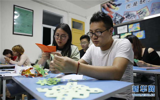 四川省華鎣市慶合初級中學教師王俊又(右一)與許玉玲在練習剪紙(4月17日攝)。慶合初級中學位于華鎣山腳下,由于距離縣城較遠,該校大部分教師長期“以校為家”。