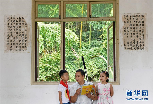 在江西南昌灣里區(qū)立新村立新學校,鄉(xiāng)村教師高自仁在課間休息時給學生講解科學知識(9月3日攝)。因患小兒麻痹左腿行動不便的高自仁1977年高中畢業(yè)后回到老家,在位于梅嶺大山深處的山村里做一名教師。41年來,高自仁拄著拐杖跋涉在崎嶇山路,堅守在三尺講臺,培養(yǎng)了一批又一批學生,幫助他們走出大山。新華社記者 萬象 攝