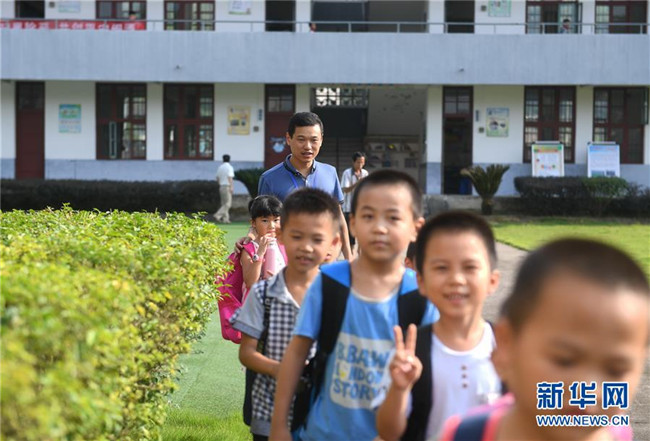 9月6日,福建閩清縣上蓮鄉(xiāng)中心小學教師張鐘在放學后送孩子們回家。2006年,“80后”教師張鐘投身鄉(xiāng)村教育事業(yè),主動要求到偏遠教學點任教。為了能安心工作,他還動員妻子和父母都搬到上蓮鄉(xiāng)工作生活,幫他一起照顧?quán)l(xiāng)村學校里的孩子們。十多年來,張鐘扎根鄉(xiāng)村,堅守在教書育人的崗位上。新華社記者 林善傳 攝