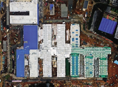 在武漢火神山、雷神山醫(yī)院建設(shè)中,基于北斗衛(wèi)星導(dǎo)航系統(tǒng)的高精度定位設(shè)備火速馳援,確保工地大部分放線測量一次完成。這是無人機拍攝的武漢火神山醫(yī)院。記者 李賀 攝