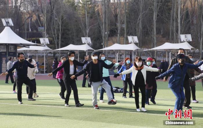 資料圖:3月20日,西寧市戶外體育場(chǎng)所已全部開(kāi)放,市民在體育場(chǎng)上跳起鍋莊。 中新社記者 馬銘言 攝