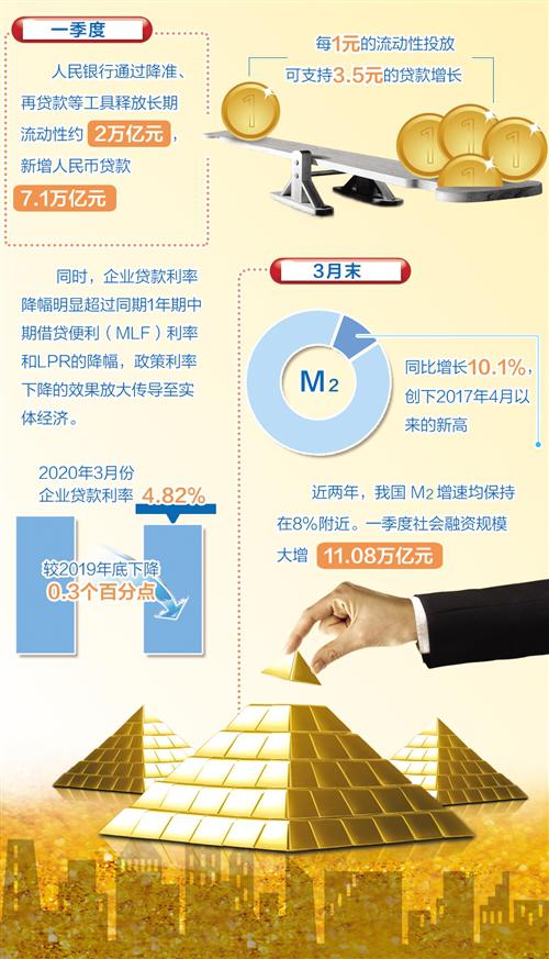從引導(dǎo)貸款投放看,一季度中國(guó)人民銀行通過(guò)降準(zhǔn)、再貸款等工具釋放長(zhǎng)期流動(dòng)性約2萬(wàn)億元,新增人民幣貸款7.1萬(wàn)億元,每1元的流動(dòng)性投放可支持3.5元的貸款增長(zhǎng),是1∶3.5的倍數(shù)放大效應(yīng)。