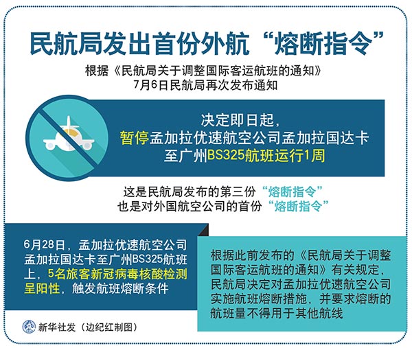 根據(jù)此前發(fā)布的《民航局關(guān)于調(diào)整國(guó)際客運(yùn)航班的通知》有關(guān)規(guī)定,民航局決定對(duì)孟加拉優(yōu)速航空公司實(shí)施航班熔斷措施,并要求熔斷的航班量不得用于其他航線。(記者齊中熙)