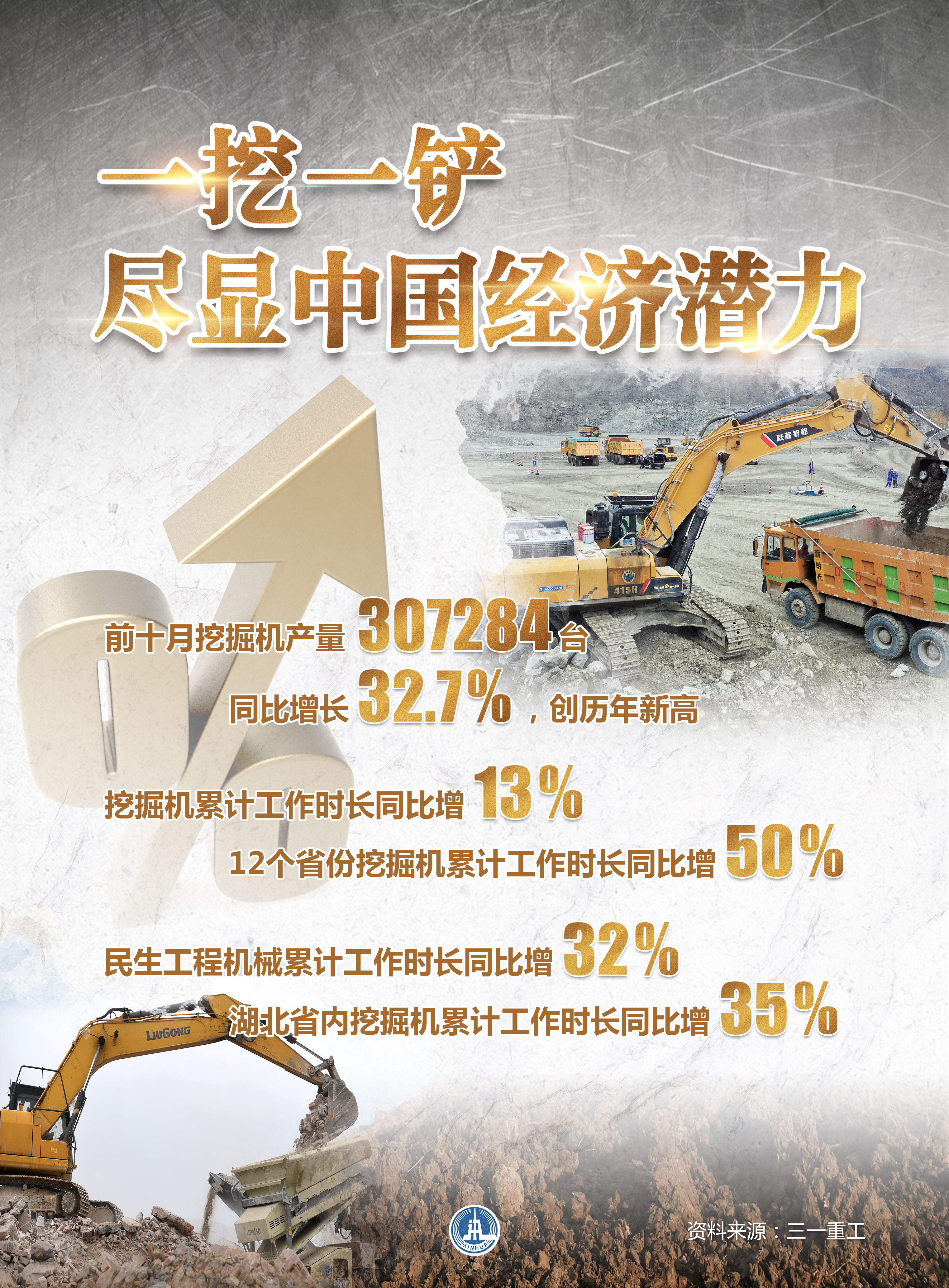 國(guó)家統(tǒng)計(jì)局最新數(shù)據(jù)顯示,10月份,我國(guó)挖掘機(jī)產(chǎn)量35098臺(tái),同比增長(zhǎng)42.4%;前十月挖掘機(jī)產(chǎn)量307284臺(tái),同比增長(zhǎng)32.7%,創(chuàng)歷年新高。