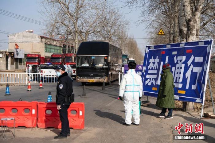 圖為距離增村鎮(zhèn)約4公里、距離小果莊村約8公里的一處疫情防控檢查點,運送異地集中隔離觀察人員的車輛通過此地。 中新社記者 侯宇 攝