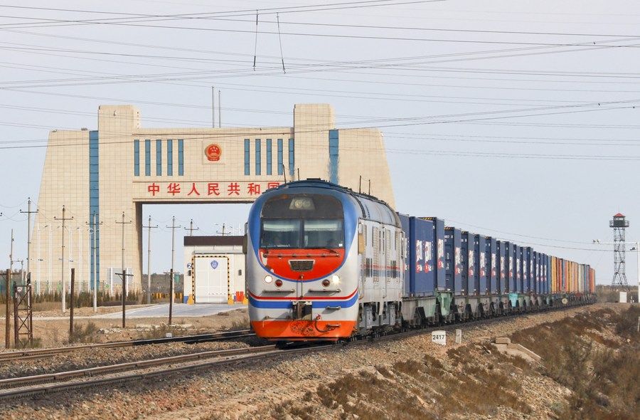 2017年4月24日,首趟中歐班列(倫敦-義烏)從中國阿拉山口口岸入境。新華社發(fā)(張永恒 攝)