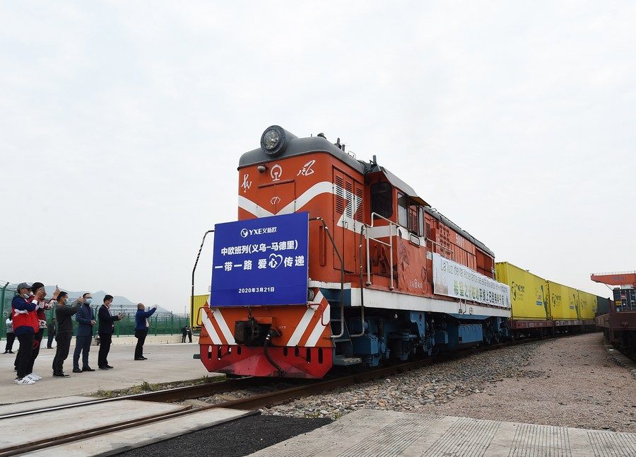 2020年6月5日,滿載防疫物資的“義新歐”中歐班列(義烏-馬德里)在義烏西站啟程,前往西班牙首都馬德里。新華社發(fā)(呂斌 攝)