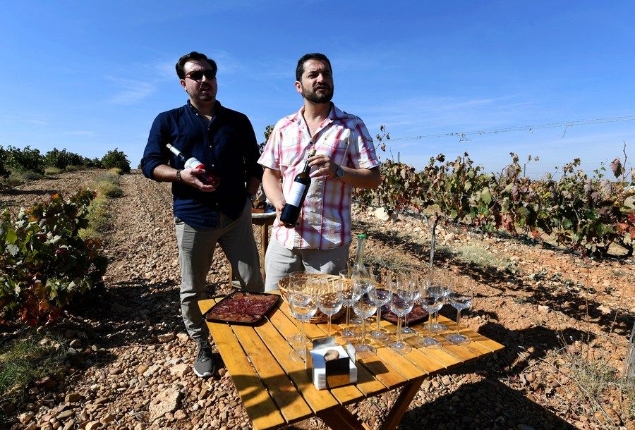 2017年9月24日,在西班牙葡萄酒產(chǎn)區(qū)巴亞多利德市的一處葡萄園內(nèi),兩名村民在展示當(dāng)?shù)蒯劸频钠咸选_@里的葡萄酒有一部分會(huì)通過“義新歐”班列出口到中國。新華社發(fā) (郭求達(dá) 攝)