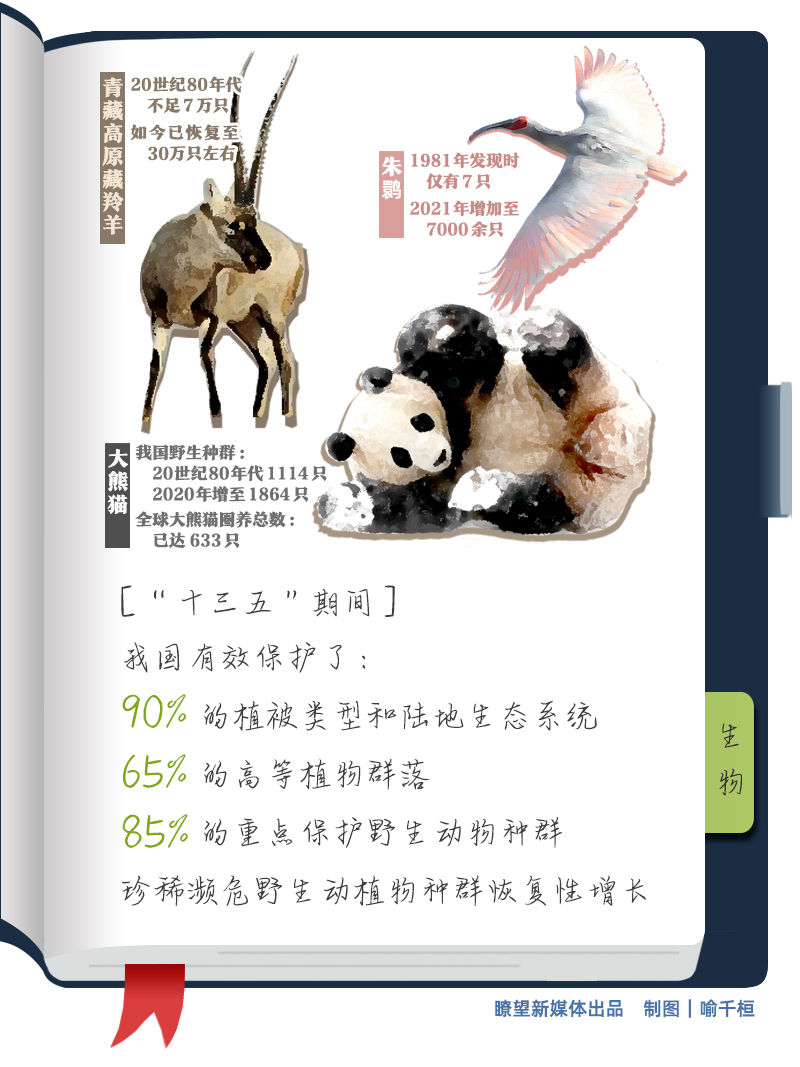 瀕危野生動(dòng)植物保護(hù)不斷強(qiáng)化。“十三五”期間,我國有效保護(hù)了90%的植被類型和陸地生態(tài)系統(tǒng)、65%的高等植物群落,85%的重點(diǎn)保護(hù)野生動(dòng)物種群,大熊貓、朱鹮、藏羚羊、蘇鐵等珍稀瀕危野生動(dòng)植物種群實(shí)現(xiàn)恢復(fù)性增長。