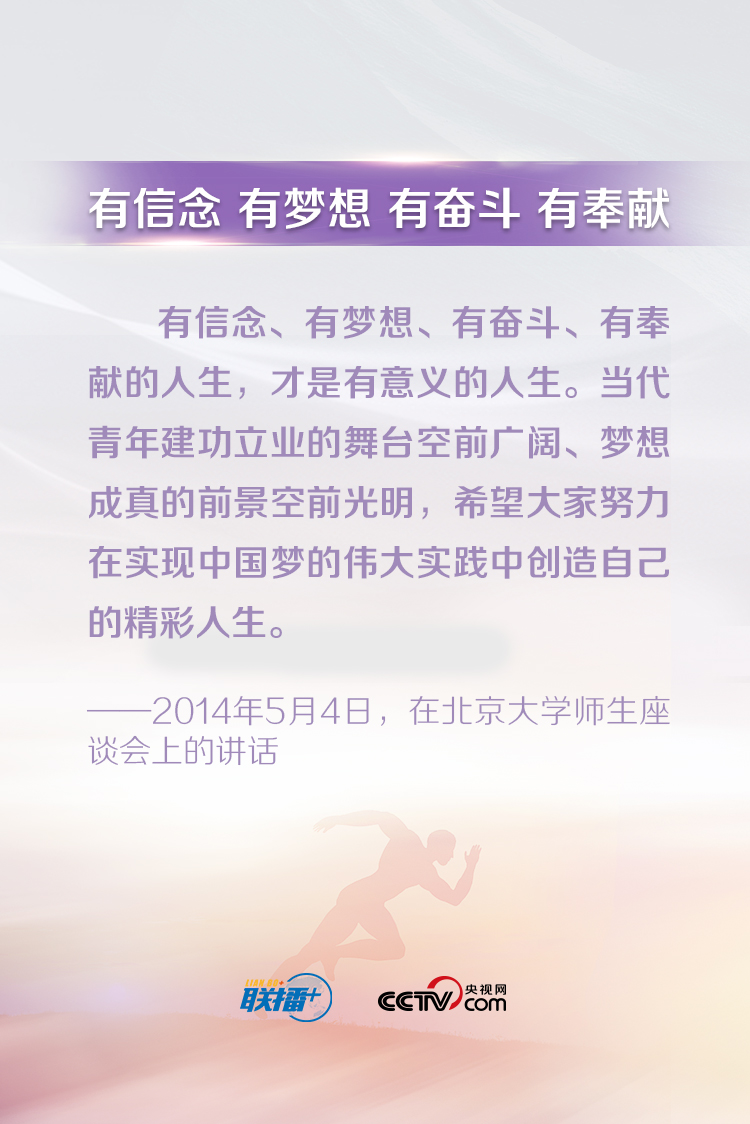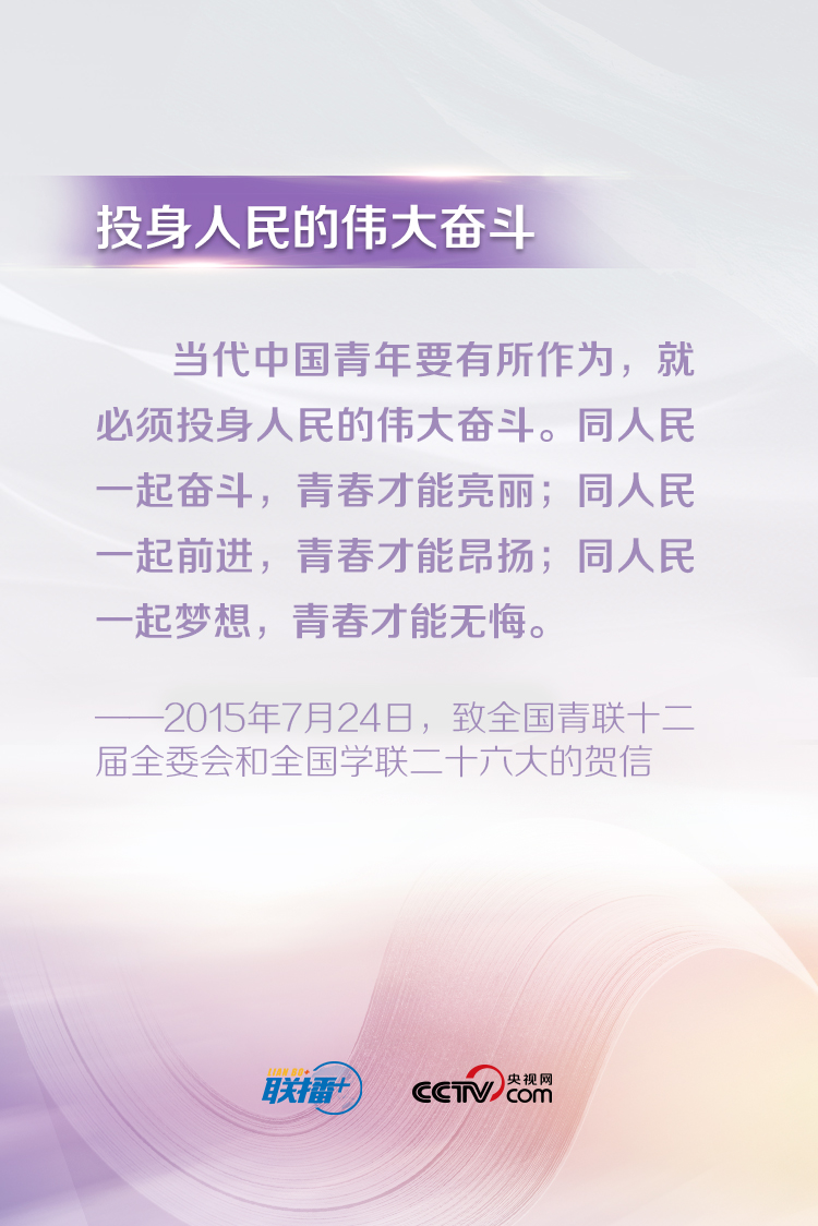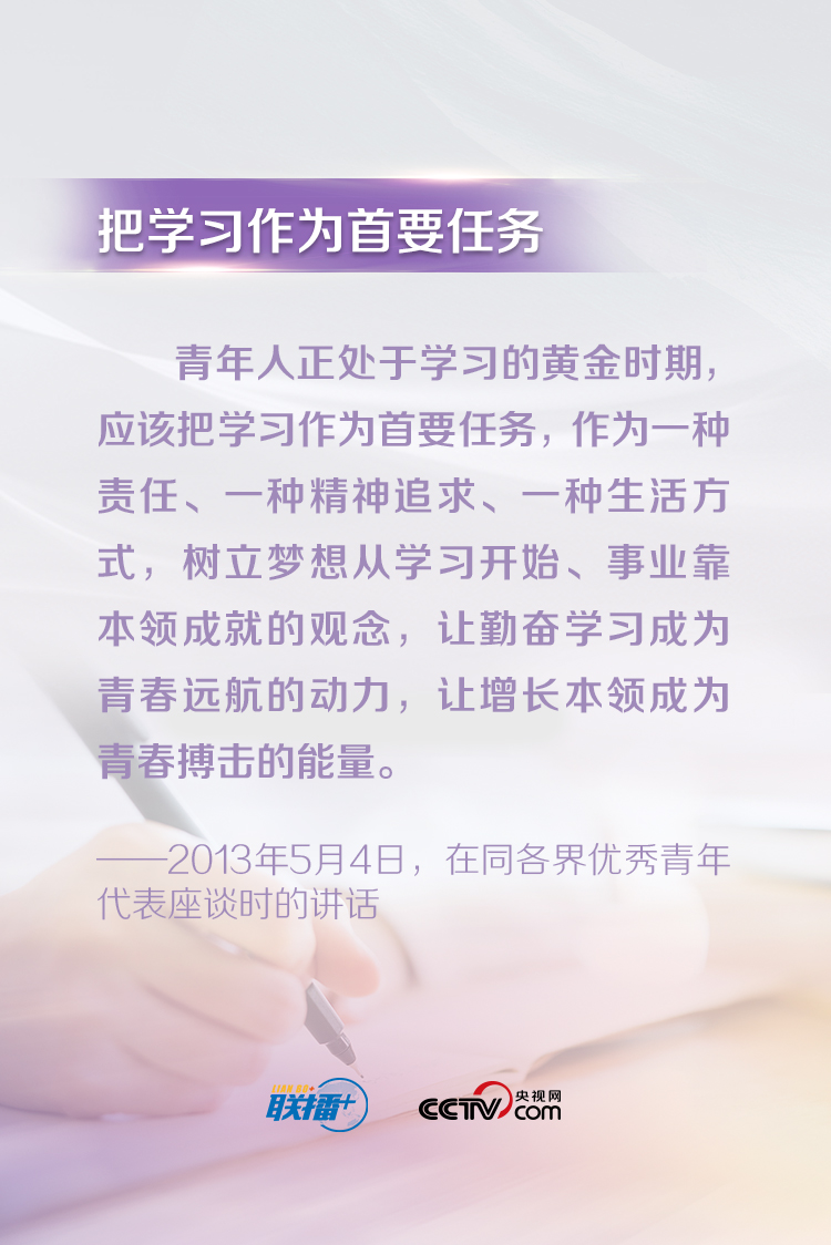 習(xí)近平總書記一直以來都十分關(guān)心青年成長(zhǎng)成才,常常走近青年、傾聽青年、鼓勵(lì)青年。他說,“青年最富有朝氣、最富有夢(mèng)想”,“中華民族偉大復(fù)興終將在廣大青年的接力奮斗中變?yōu)楝F(xiàn)實(shí)”。央視網(wǎng)《聯(lián)播+》特梳理總書記對(duì)廣大青年的寄語,與您一起學(xué)習(xí)。