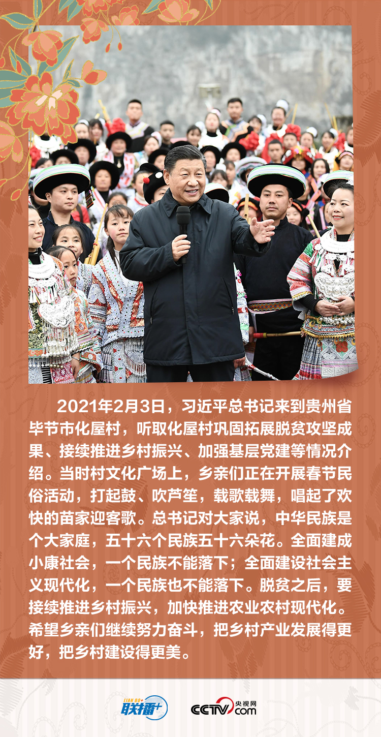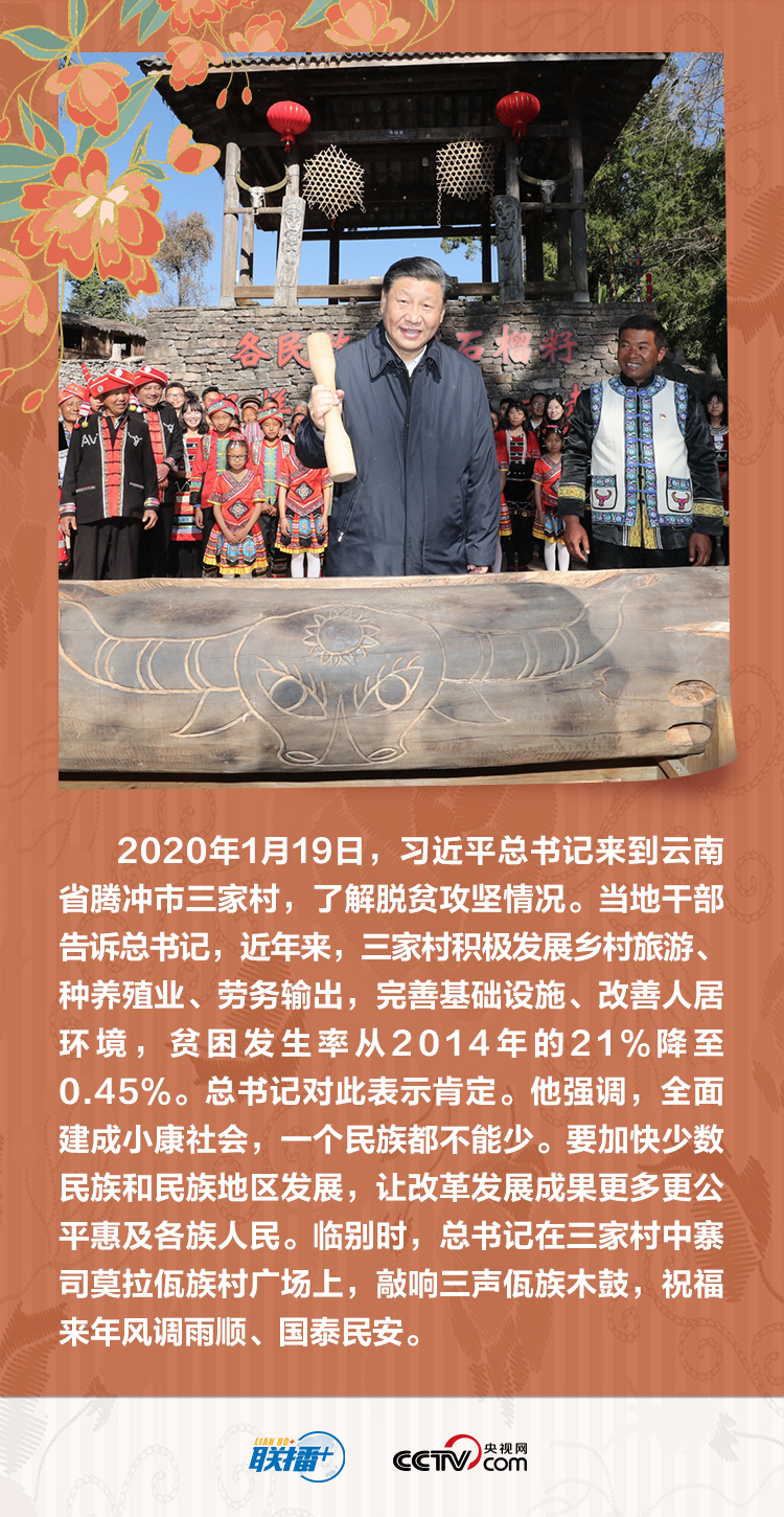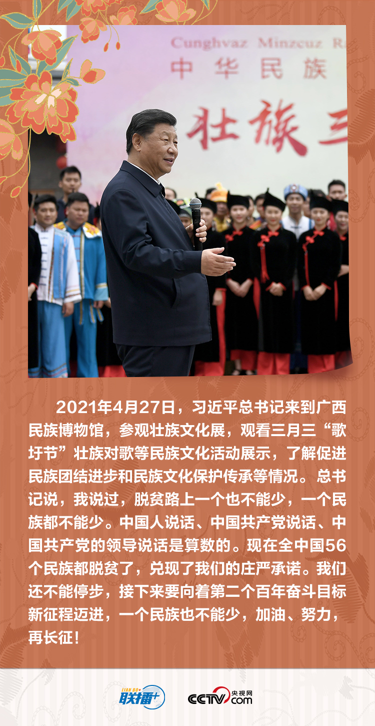 黨的十八大以來,總書記多次深入少數(shù)民族地區(qū)考察,足跡遍及祖國北疆、西南邊陲、雪域高原、天山南北,他頻頻強(qiáng)調(diào)“一個(gè)民族都不能少”這個(gè)莊嚴(yán)承諾。