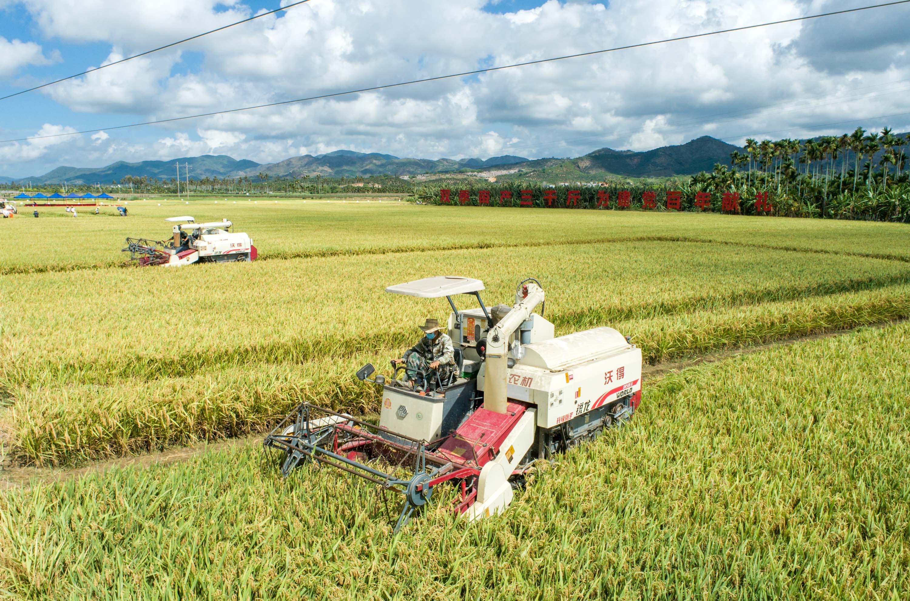 △2021年5月14日,在海南三亞市崖州區(qū)(壩頭)南繁公共試驗(yàn)基地,聯(lián)合收割機(jī)在收割“超優(yōu)千號”雜交水稻。