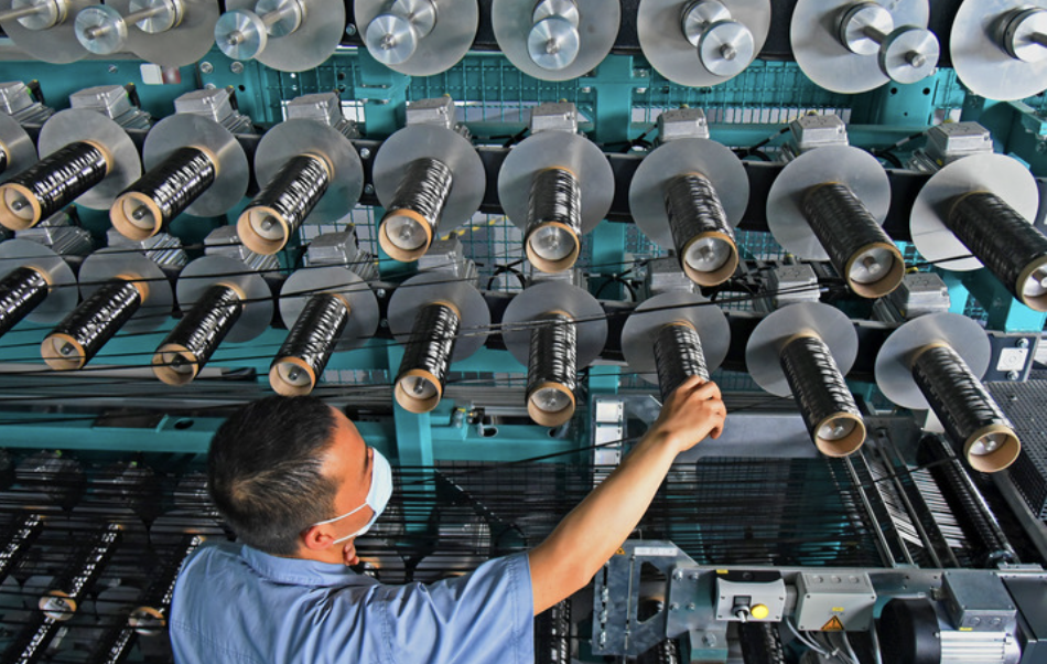 在江蘇連云港經(jīng)濟技術(shù)開發(fā)區(qū),工人在查看碳纖維生產(chǎn)線運行情況。新華社發(fā)(耿玉和 攝)