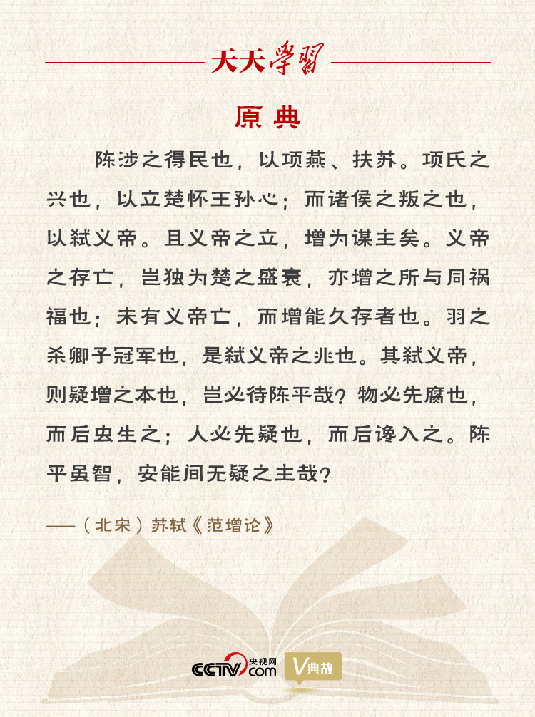 《范增論》是蘇軾早期的一篇史論文章,收錄在《古文觀止》卷十。文中蘇軾針對陳平用計離間項羽和范增的觀點,翻空出奇,立意新穎地提出:“物必先腐也,而后蟲生之;人必先疑也,而后讒入之。”作者打了個比方,東西總是自身先腐爛,然后蟲子才會寄生,說明事物總是自己先有弱點然后才為外物所侵。指出正是由于項羽生性多疑,聽信讒言,才被敵人利用,從而招致慘敗。