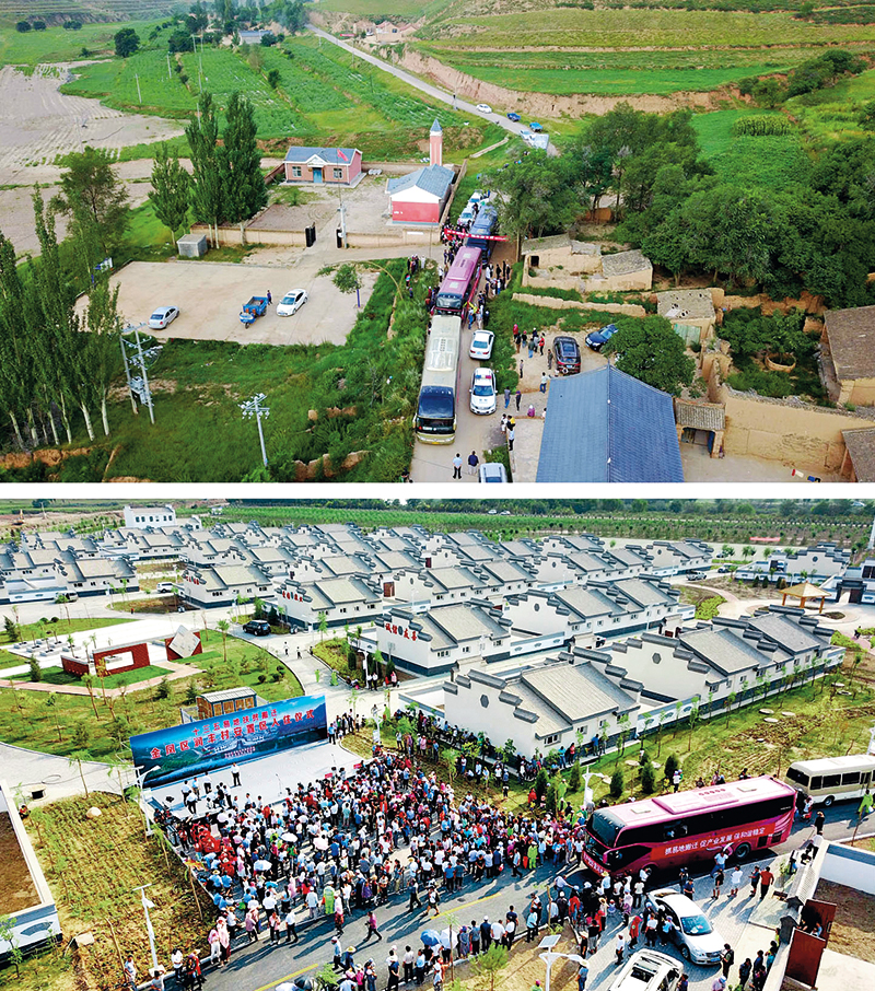 上圖為寧夏西吉縣白崖鄉(xiāng)半子溝村村民準(zhǔn)備集體搬遷至寧夏銀川市金鳳區(qū)潤豐村。下圖為銀川市金鳳區(qū)潤豐村迎來首批138戶移民入住,來自半子溝村的群眾統(tǒng)一乘坐大巴搬出大山,來移民新村開始新生活(2017年8月17日攝) 王鵬攝/本刊