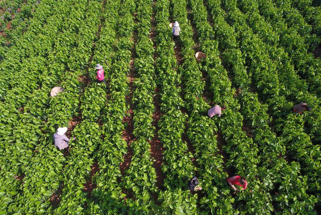 云南省尋甸縣金所街道草海子村的農(nóng)婦在采摘蠶桑葉(2020年5月16日攝,無人機(jī)照片)。新華社記者 楊宗友 攝