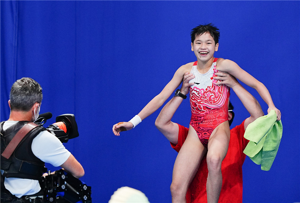 2021年8月5日,全紅嬋在比賽中。當(dāng)日,在東京奧運(yùn)會(huì)跳水項(xiàng)目女子10米跳臺(tái)決賽中,中國選手全紅嬋奪得冠軍。新華社記者 丁旭 攝