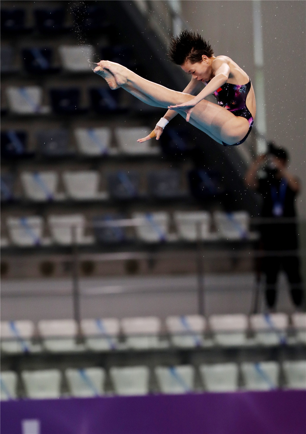 2020年10月4日,全紅嬋在比賽中。當(dāng)日,在河北奧體中心舉行的2020年全國跳水冠軍賽暨東京奧運(yùn)會(huì)、世界杯預(yù)選賽女子10米跳臺(tái)決賽中,廣東海印隊(duì)選手全紅嬋奪得冠軍。新華社記者 王曉 攝