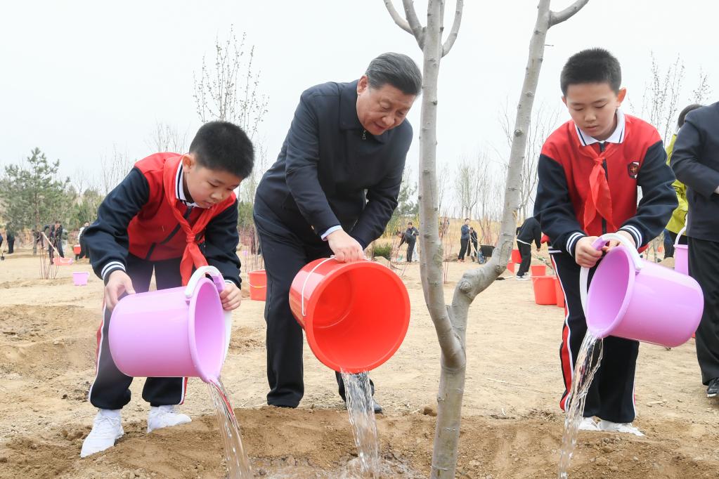 2021年4月2日,習(xí)近平總書記來到北京市朝陽區(qū)溫榆河參加首都義務(wù)植樹活動。這是習(xí)近平總書記同少先隊員一起給剛栽下的樹苗澆水。新華社記者 李學(xué)仁 攝