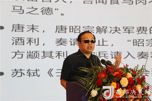 陜西師范大學(xué)歷史文化學(xué)院教授、博士生導(dǎo)師于賡哲教授以《西鳳高飛——講好中國的酒故事》為題作了酒文化分享。他從穆公賜酒、唐代榷酒、蘇軾詠酒、明清燒坊等方面講述了西鳳酒悠久的歷史文化,同時對西鳳酒的發(fā)展提出了思考,他講到白酒行業(yè)的營銷要重視文化底蘊(yùn)、緊抓年輕一代消費(fèi)者的品味,號召大家要弘揚(yáng)好西鳳酒,講好中國酒故事。