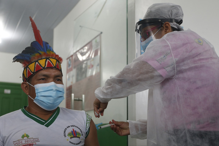 醫(yī)護(hù)人員在巴西亞馬孫州塔巴廷加市為一名原住民接種中國新冠疫苗(1月19日攝)。新華社發(fā)(盧西奧·塔沃拉攝)