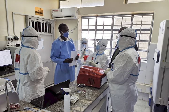 在南蘇丹首都朱巴的一處新冠病毒檢測機(jī)構(gòu),中國抗疫醫(yī)療專家組成員與南一線醫(yī)護(hù)人員交流(2020年8月21日攝)。新華社發(fā)(中國駐南蘇丹大使館供圖)