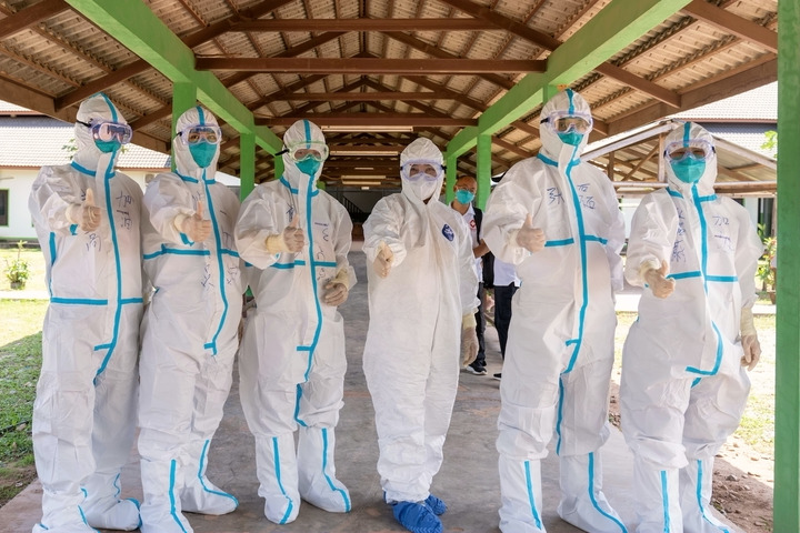 中國抗疫專家組在老撾北部烏多姆賽省準(zhǔn)備進(jìn)入新冠確診患者隔離病房(5月10日攝)。新華社發(fā)(農(nóng)麗春攝)