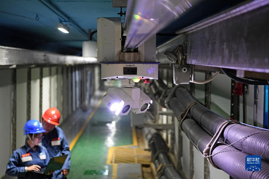 在珠海橫琴綜合管廊電力隧道里,南方電網(wǎng)工作人員操作巡檢機(jī)器人對電纜隧道動態(tài)巡檢(2019年12月12日攝)。新華社記者 梁旭 攝