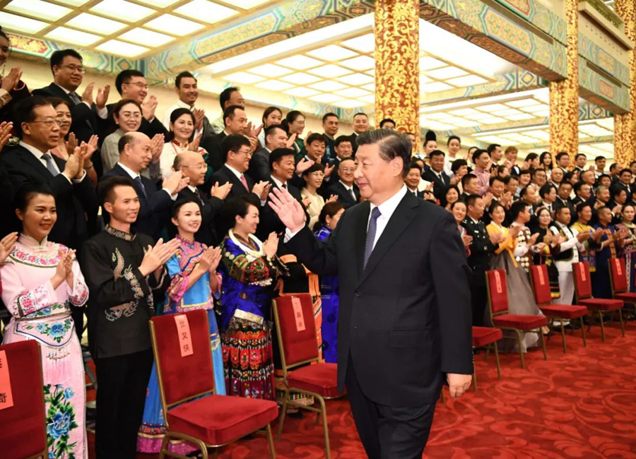 ▲ 8月31日晚,第六屆全國少數(shù)民族文藝會演開幕式文藝晚會在北京人民大會堂隆重舉行。習(xí)近平、李克強(qiáng)、汪洋、王滬寧等黨和國家領(lǐng)導(dǎo)人出席觀看。這是演出開始前,習(xí)近平等會見文藝會演演職人員代表、組委會成員、56個民族的優(yōu)秀基層黨員代表等 燕雁攝/本刊