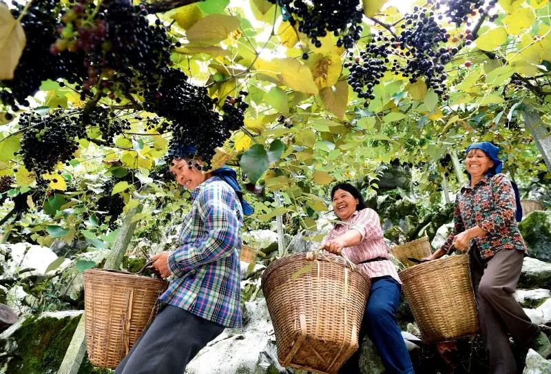 ▲ 9月1日,廣西都安瑤族自治縣菁盛鄉(xiāng)加禾村,當(dāng)?shù)卮迕駥倓偛烧纳狡咸寻嵯律?。目前,山葡萄已成為?dāng)?shù)剞r(nóng)民增收和鄉(xiāng)村振興的重要產(chǎn)業(yè) 周華攝/本刊