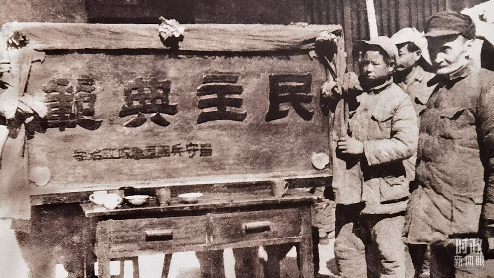 △陜甘寧邊區(qū)政府接受八路軍留守兵團(tuán)贈(zèng)送的“民主典范”牌匾。(總臺(tái)央視記者馬立飛提供)