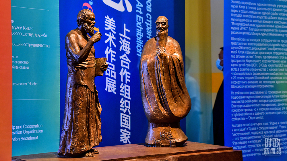△2021年9月7日,“同一夢想——上海合作組織國家美術作品展”在北京開展。這是中國雕塑家吳為山的作品《神遇——孔子與蘇格拉底的對話》。(圖/視覺中國)