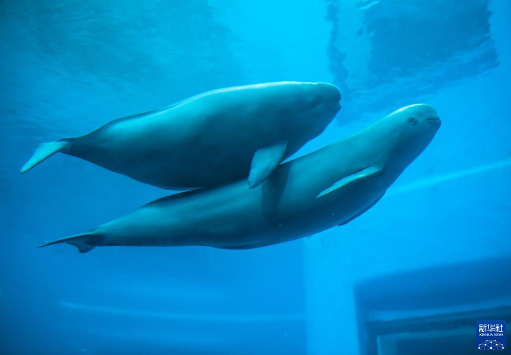2021年7月5日,在位于武漢的中國(guó)科學(xué)院水生生物研究所,長(zhǎng)江江豚媽媽和小江豚在水中游動(dòng)。新華社記者 肖藝九 攝