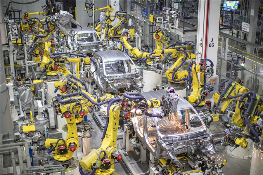 在重慶金康新能源汽車有限公司,智能化焊接機(jī)器人在進(jìn)行焊接作業(yè)(4月2日攝)。新華社記者 黃偉 攝
