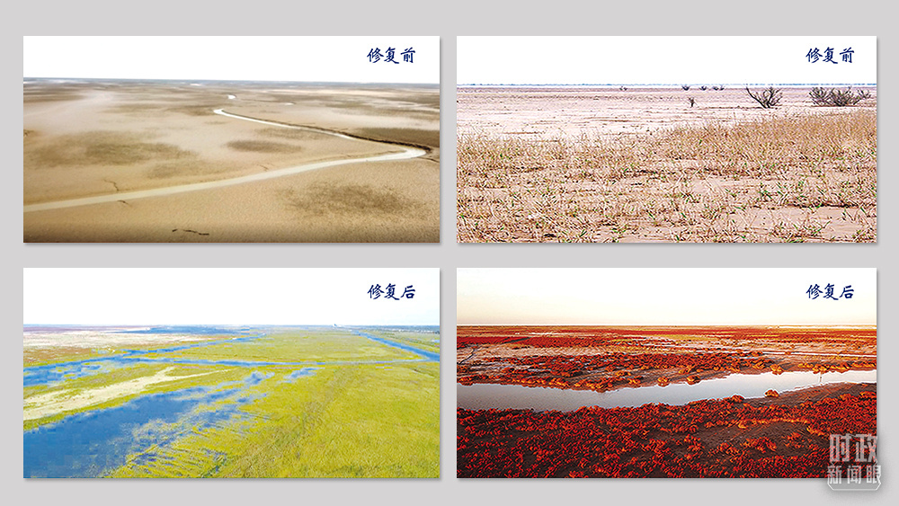 △黃河口河流沼澤濕地(左)和鹽沼濕地(右)生態(tài)修復對比圖。(總臺央視記者盧心雨提供)