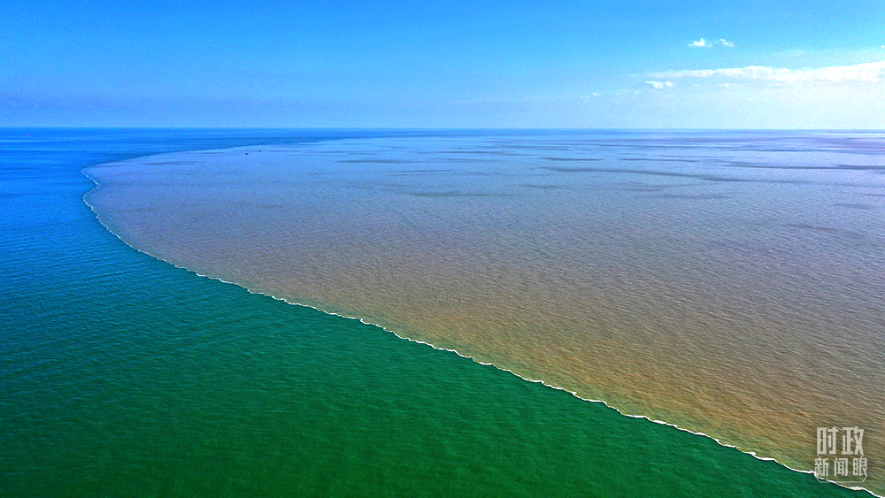 △俯瞰入???,雄渾的黃河與碧藍的大海相融。(總臺央視記者程鋮拍攝)