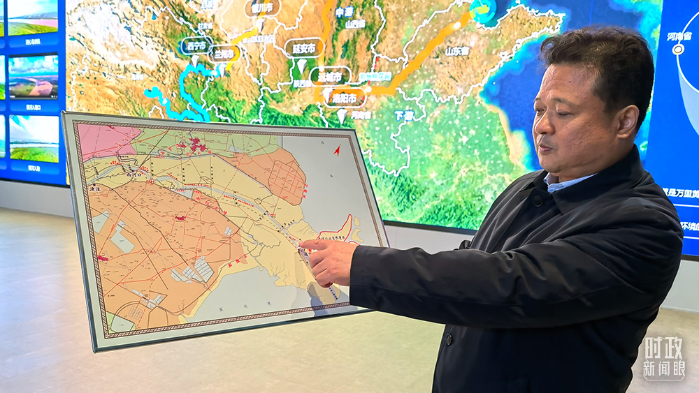 △黃河河口管理局局長裴明勝正在介紹黃河三角洲的防洪設施建設。(總臺央視記者韓銳拍攝)