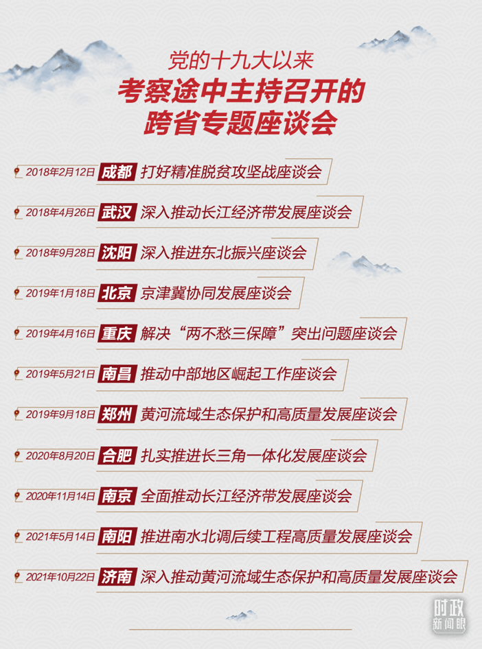 《時政新聞眼》梳理發(fā)現(xiàn),加上這次座談會,黨的十九大以來,習近平總書記在考察途中一共主持召開了11場跨省座談會。除了3場聚焦脫貧攻堅、南水北調(diào)外,其他8場關注的都是區(qū)域協(xié)調(diào)發(fā)展的重大戰(zhàn)略和部署。