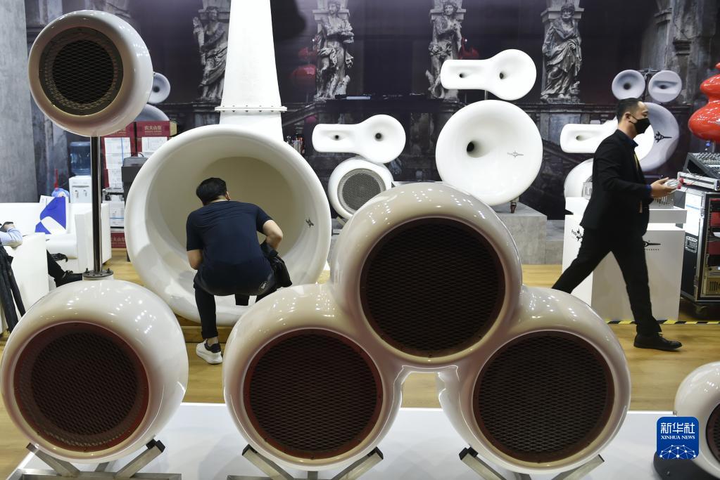 11月6日,參會者在第四屆進博會展館里的意大利PEQUOD公司展位參觀音響設(shè)備。PEQUOD公司首次參展進博會。新華社記者 魯鵬 攝