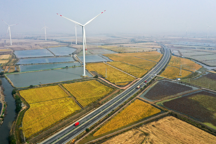 圖為11月3日拍攝的江蘇省揚(yáng)州市寶應(yīng)縣魯垛鎮(zhèn)5.28萬(wàn)千伏安風(fēng)力發(fā)電項(xiàng)目(無(wú)人機(jī)照片)。新華社記者 李博 攝