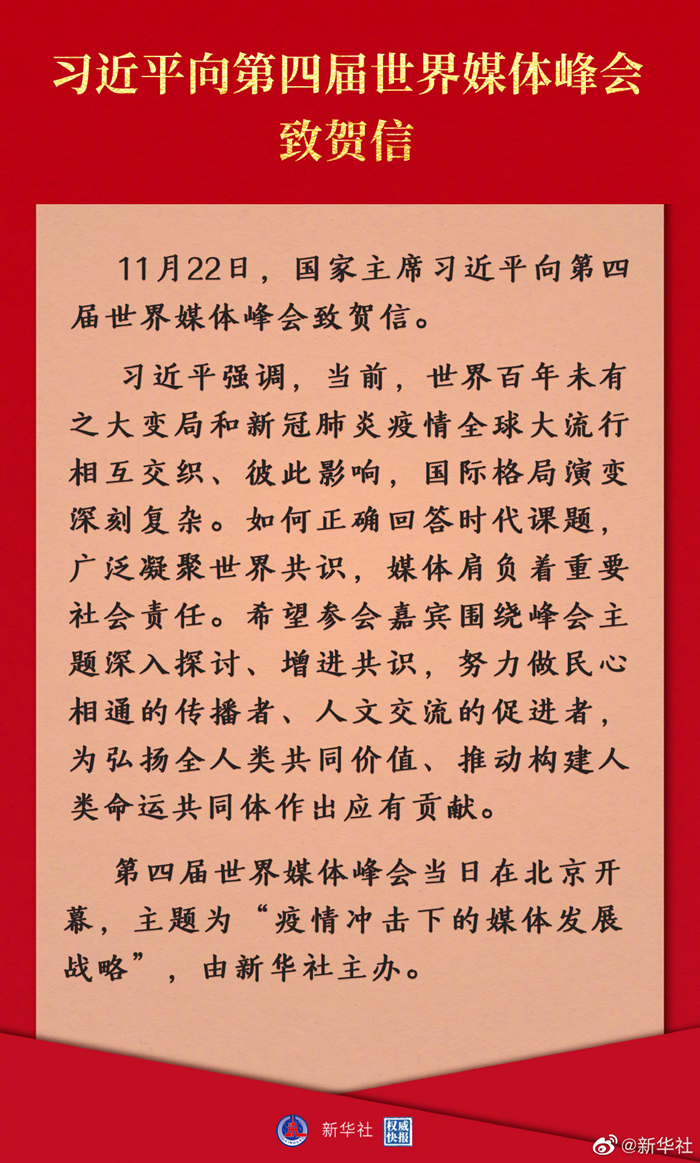 新華社北京11月22日電 11月22日,國家主席習(xí)近平向第四屆世界媒體峰會(huì)致賀信。