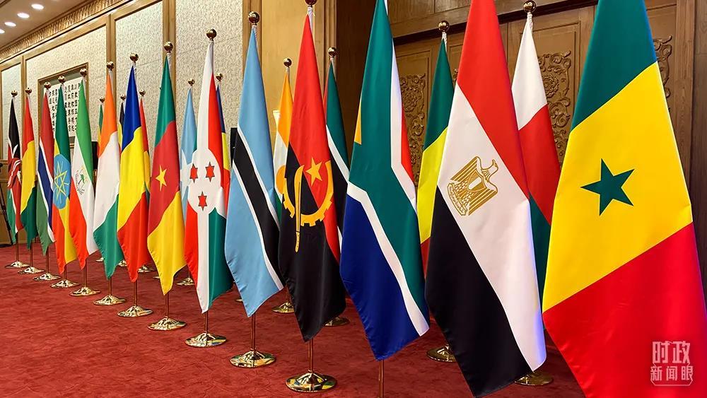 △東大廳內(nèi),中國(guó)和53個(gè)非洲國(guó)家國(guó)旗以及非洲聯(lián)盟旗幟組成的旗陣。(總臺(tái)央視記者范一鳴拍攝)