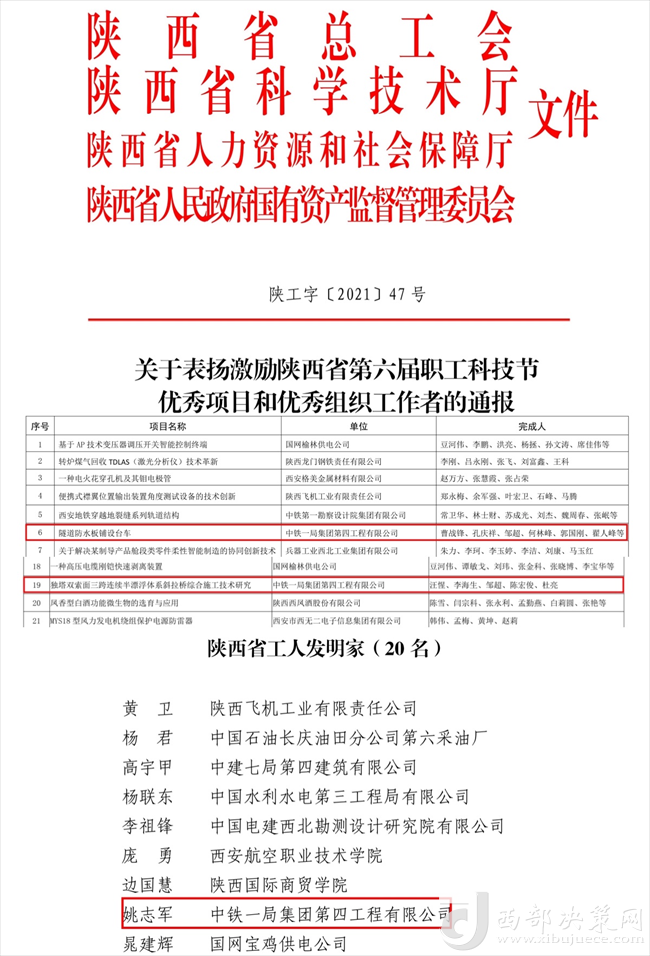 西部決策網(wǎng)訊近日,在陜西省總工會、科技廳、人社廳、國資委聯(lián)合開展的陜西省第六屆職工科技節(jié)活動中,中鐵一局四公司機(jī)械修造廠憑借成果《隧道防水板鋪設(shè)臺車》榮獲陜西省職工優(yōu)秀創(chuàng)新成果二等獎,中鐵一局四公司工程技術(shù)管理部憑借成果《獨塔雙索面三跨連續(xù)半漂浮體系斜拉橋綜合施工技術(shù)研究》榮獲陜西省職工優(yōu)秀創(chuàng)新成果三等獎,理小路項目姚志軍被授予“陜西省工人發(fā)明家”稱號。