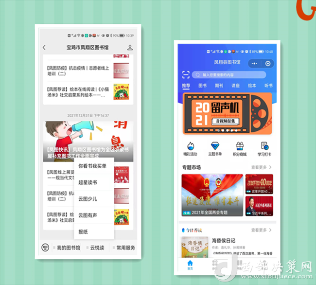 閉館不閉網(wǎng),線(xiàn)上服務(wù)不打烊。自12月23日閉館以來(lái),區(qū)圖書(shū)館整合各類(lèi)數(shù)字資源,免費(fèi)提供豐富的線(xiàn)上服務(wù),滿(mǎn)足不同年齡群體讀者的閱讀需求,更新“超星閱讀”APP,電子書(shū)、數(shù)字期刊、講座、繪本、聽(tīng)書(shū)等海量資源為讀者提供高質(zhì)量的閱讀福利。利用“陜西數(shù)字文化網(wǎng)”“鳳翔區(qū)圖書(shū)館官方網(wǎng)站”“鳳翔區(qū)圖書(shū)館”公眾微信號(hào),線(xiàn)上開(kāi)設(shè)【鳳圖戰(zhàn)疫】【鳳圖薦讀】【紅色故事繪】【館員姐姐講故事】【館員有聲薦讀】【鳳圖文苑】等閱讀服務(wù)專(zhuān)欄,提供疫情防控知識(shí)、繪本閱讀、親子故事講讀、線(xiàn)上展覽等,讀者通過(guò)關(guān)注“寶雞市鳳翔區(qū)圖書(shū)館”公眾號(hào)、網(wǎng)站享受24小時(shí)線(xiàn)上服務(wù),通過(guò)鳳翔區(qū)圖書(shū)館總分館群,將這些優(yōu)質(zhì)數(shù)字資源向基層分館輸送,讓廣大讀者暢享“云端閱讀”。