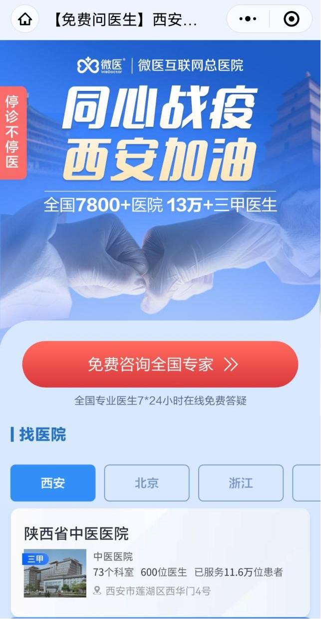 為保障當(dāng)?shù)厝罕娽t(yī)療健康需求,緩解線下醫(yī)療機(jī)構(gòu)壓力,微醫(yī)互聯(lián)網(wǎng)總醫(yī)院第一時(shí)間啟動疫情防控應(yīng)急方案,于22日迅速上線“西安抗疫專區(qū)”,集結(jié)全國專家為西安百姓免費(fèi)提供7*24小時(shí)不間斷的在線咨詢、防疫科普等服務(wù)。