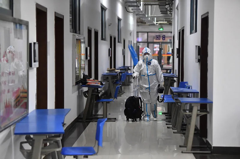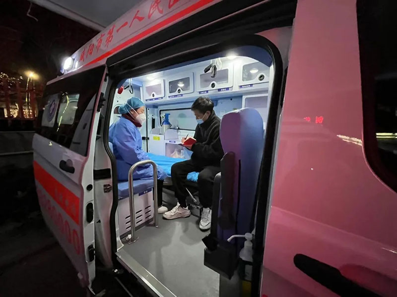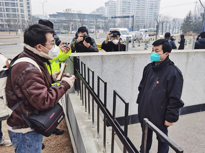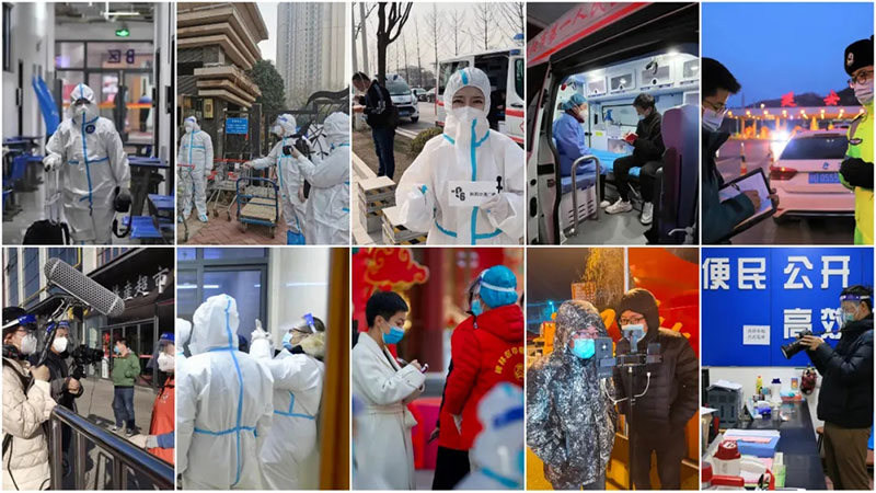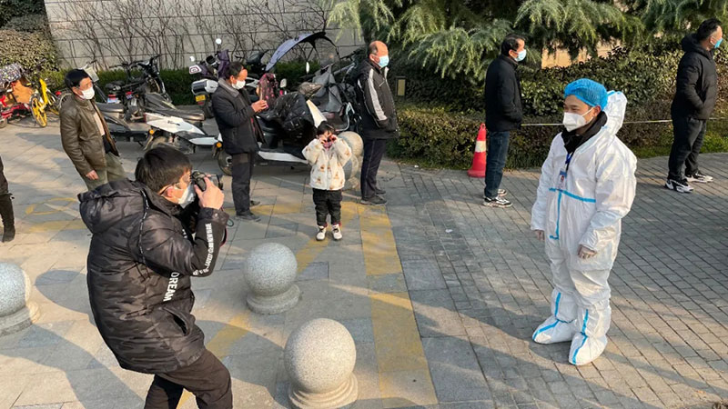 2022年1月4日,人民日報(bào)社記者原韜雄(左一)在新冠確診病例收治點(diǎn)西安市胸科醫(yī)院采訪。